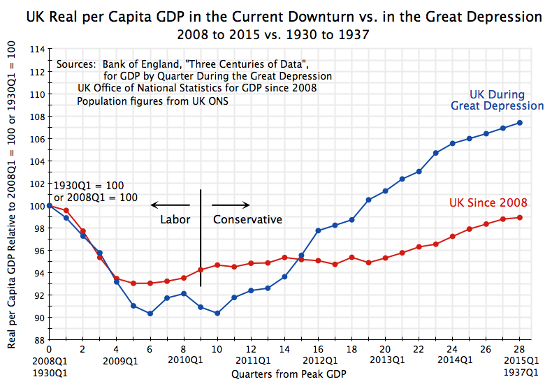 The downturn during the 2008 collapse initially traced very closely the path of the downturn during the first year of the Great Depression. But the Labour Government in power until mid-2010 was able to turn this around after about a year with stabilization and stimulative measures, with the economy then starting to grow. A Conservative led coalition (with the Liberal Democrats) then took power after the May 2010 general elections, and soon announced a sharp austerity program. After one more quarter of growth (the new austerity measures began to be implemented in the fall of 2010), the economic recovery was brought to a halt. Real per capita output was largely unchanged over the next two and a half years.