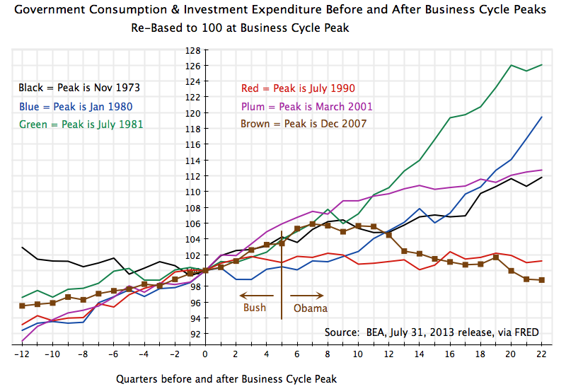 In contrast, in the current downturn direct government spending is now 1.2% below what it had been at the start of the recession in December 2007. Furthermore, it is worth noting that while it rose in the final year of the Bush presidency and then in the first half year after Obama took office (a major reason why the recovery then began), it has since fallen sharply. Government spending is now almost 7% below where it had been in mid-2009, a half year after Obama took office. Such a decline (indeed no decline) has ever happened before, going back at least four decades, as the economy has struggled to recover from a recession. The closest was during the Clinton years, when government spending was essentially flat (a 1% increase at the same point in the recovery).