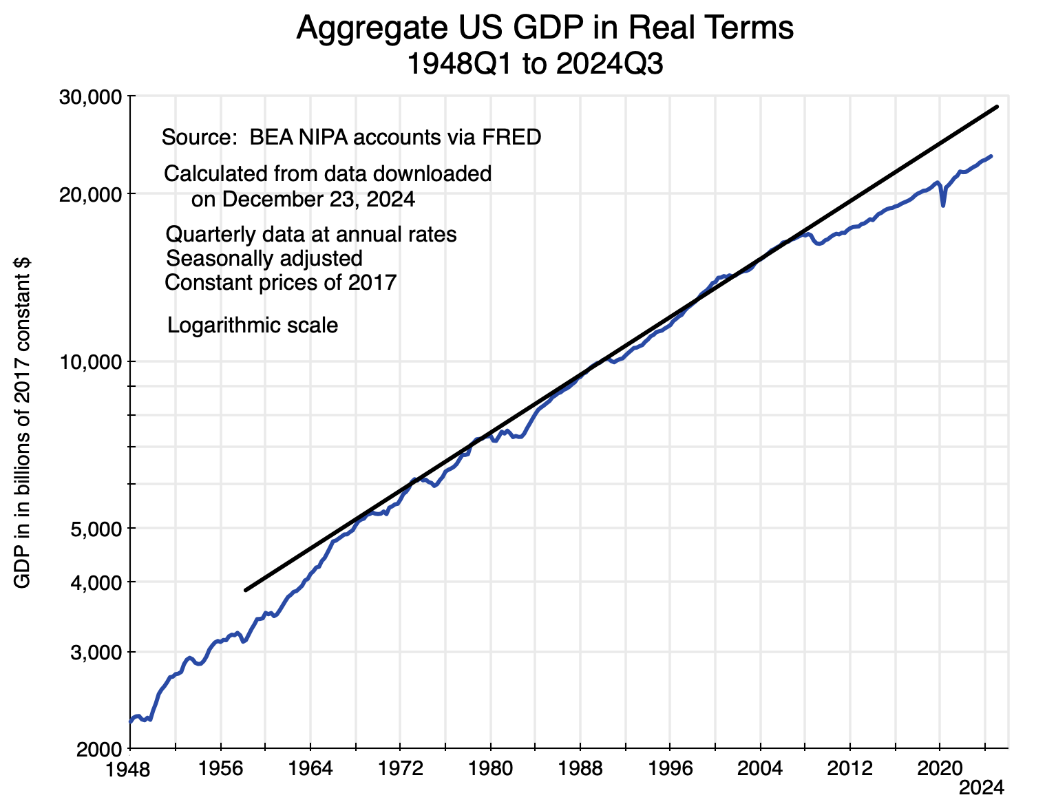 The line in orange shows what GDP would have been had labor growth continued after 2007 on its pre-2008 trend path (the path drawn in Chart 2 above), while capital grew not along its trend but rather as measured. Here one needs to take into account that the growth rate of actual employment and the growth rate of the labor force will only match between periods when the unemployment rate was the same. Thus comparisons should be limited to periods when the economy was close to full employment, such as between 2007 (when unemployment averaged 4.6%), 2016 to 2019 (annual unemployment rates of 4.9% to 3.7%), and 2022/23 (annual unemployment rates of 3.6%). That is, the “peaks” seen in the orange line in 2009 and again in 2020 are not significant, as they reflect labor not being fully used. This was not because the labor force was not available but rather due to the disruptions of the downturns in those years.