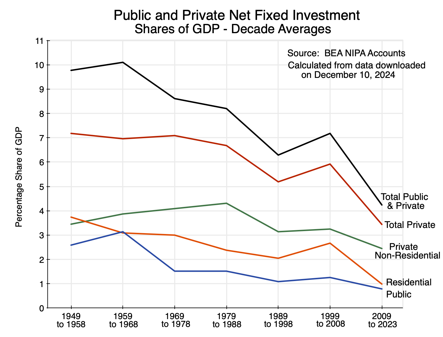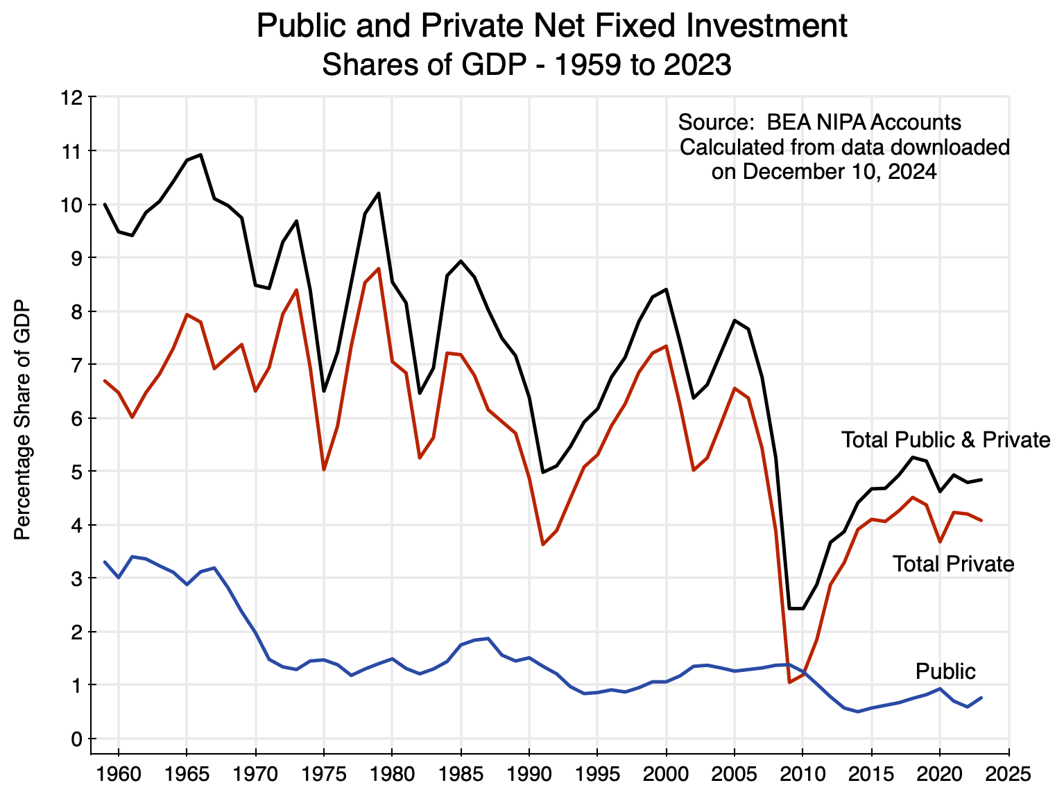 Total public and private net fixed investment fell from over 10% of GDP in the 1960s (and almost as much in the 1950s) to just 4.2% of GDP in the period from 2009 to 2023 – a fall of close to 60%. Total private net fixed investment fell from about 7% of GDP in the 1950s, 60s, and 70s, to just 3.4% since 2009 – a fall by half. Public net fixed investment fell even more sharply: from over 3% of GDP in the 1960s to just 0.8% of GDP in recent years – a reduction of three-quarters (in the figures before rounding). It should be no surprise why public infrastructure is so embarrassingly poor in the US.
