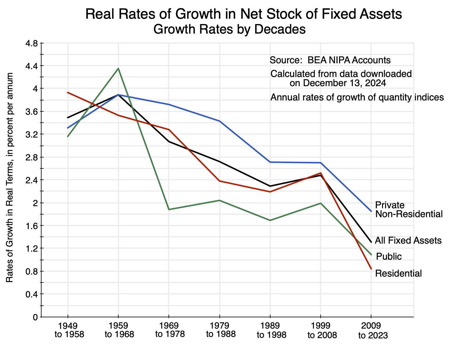 Based on their net fixed investment estimates and other data, the BEA also provides estimates of how the accumulated stock of real fixed capital has changed over time, with those levels shown in terms of quantity indices. The resulting rates of growth in accumulated capital (which the BEA refers to, more precisely, as the net stock of fixed assets) have declined sharply with the reductions in the net investment shares: