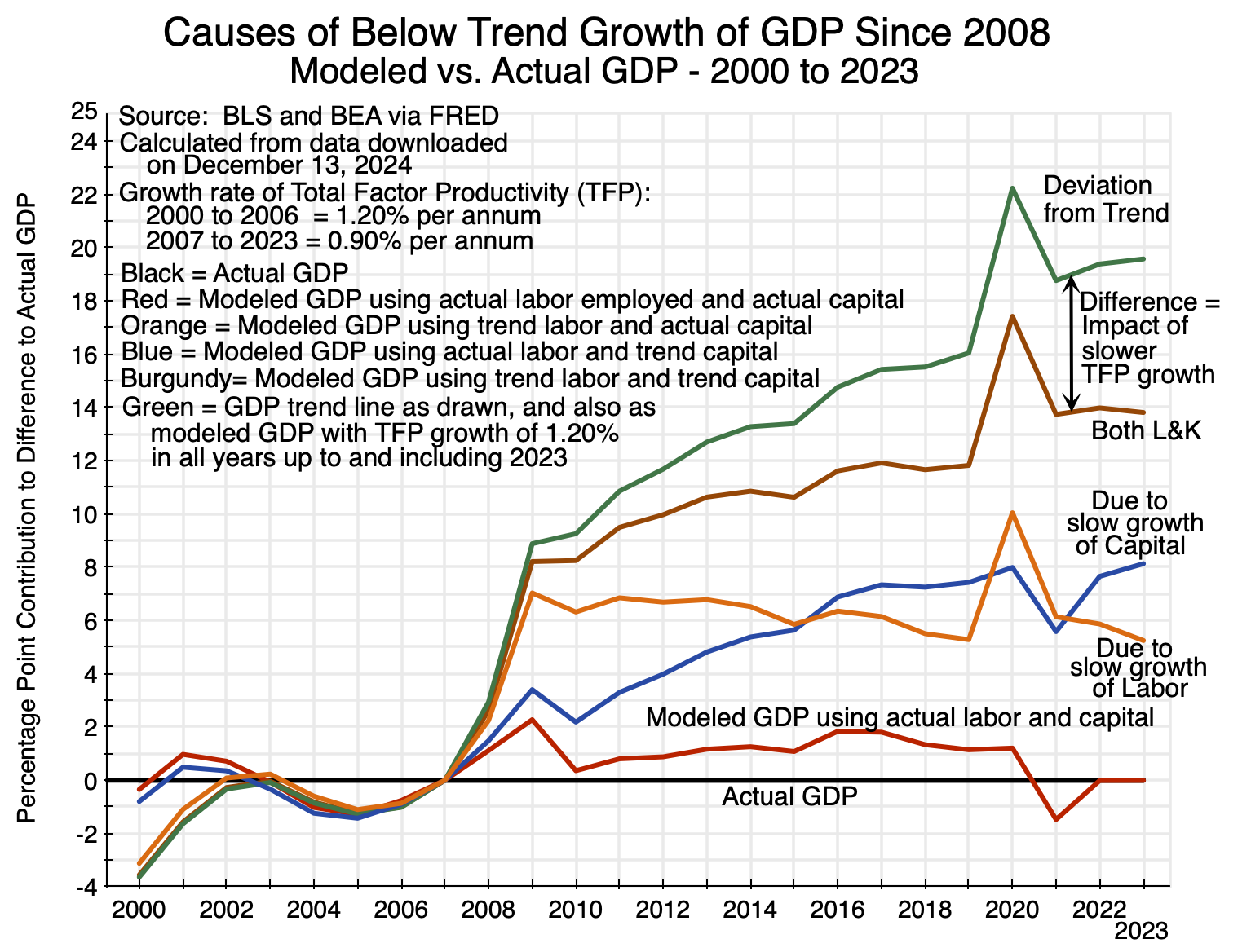 Based on these simulations, as of 2023 approximately 25% of the shortfall in GDP relative to what it would have been had it continued on its pre-2008 trend can be attributed to a fall in the rate of productivity growth (TFP) from 1.20% to 0.90%. Of the remaining shortfall, approximately 60% was due to the slowdown in investment and hence capital accumulation, and approximately 40% was due to the slowdown in the growth of the labor force. Or put another way (and keeping in mind that the impacts are not linearly additive, but only approximately so), of the total shortfall in 2023, about 70% was due to the slowdown in productivity growth together with the related slowdown in capital growth, and about 30% was due to the slowdown in labor force growth.