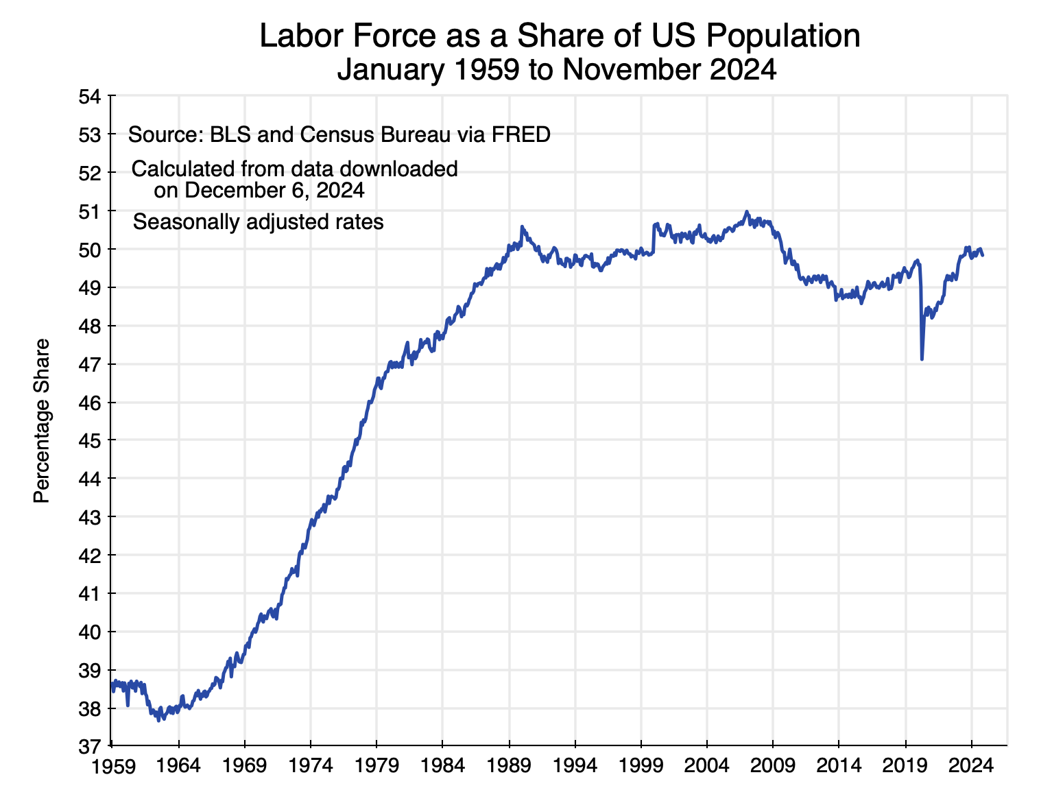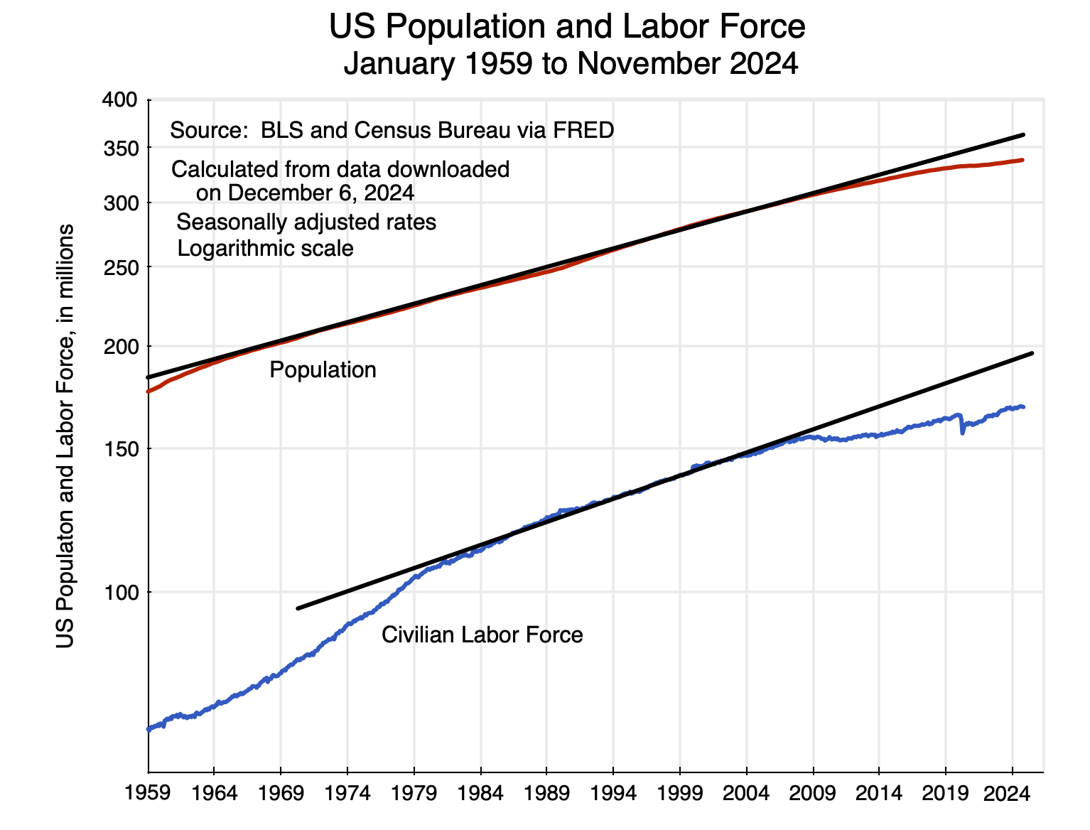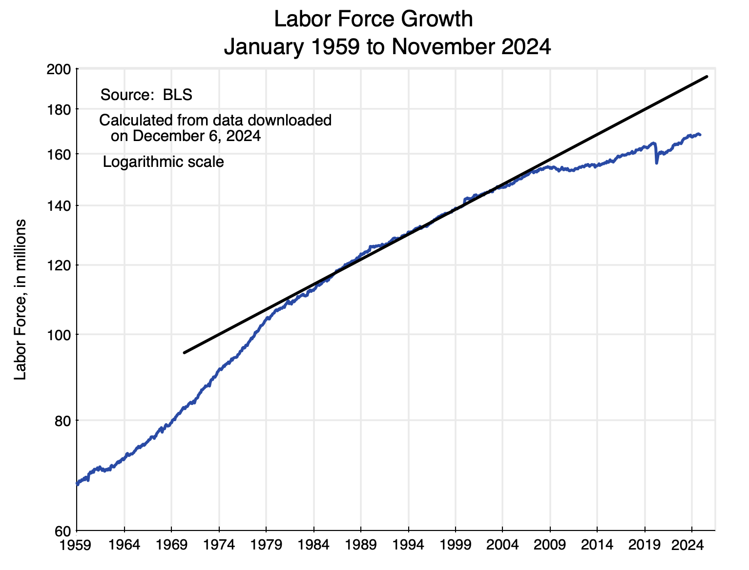 But then that steady rise in the labor force (of about 1.3% per annum before 2008) decelerated sharply. The growth rate fell to only 0.5% per year between 2007 and 2023. Why?