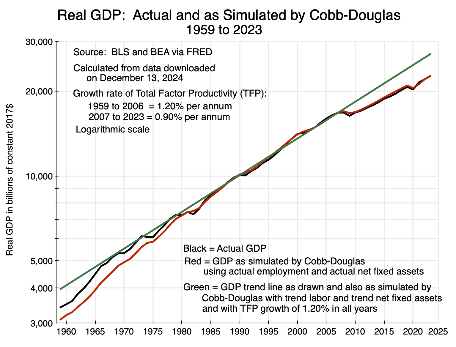 The red line shows the path for the simulated GDP, where from 2007 onwards the assumed TFP growth rate was 0.90%. The fit is very good, and especially in 2022 and 2023 – the years of most interest to us – when the simulated GDP (from the Cobb-Douglas) is almost identical to actual GDP. These are both well below the path (the green line) that would have been followed based on the previous trend growth in labor and capital, as well as the continuation of productivity growth at a 1.20% rate rather than falling to 0.90%.