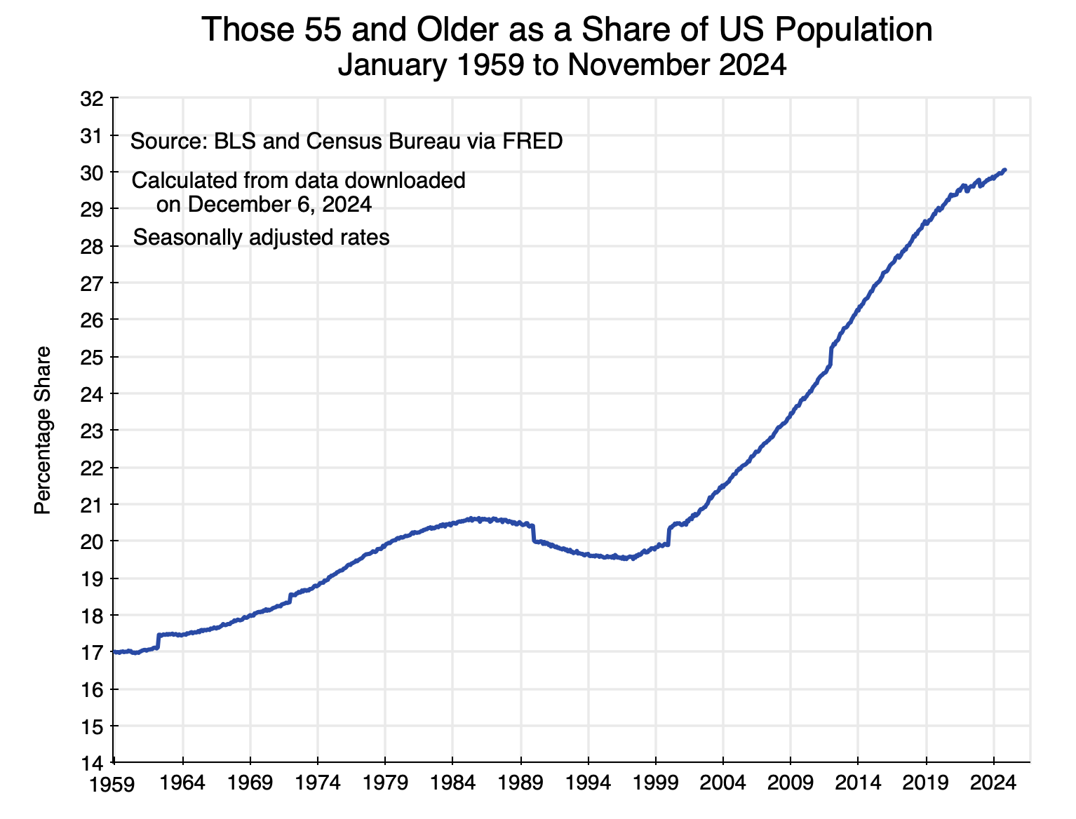Rather, the labor force has been aging, with a growing share of the population now in the normal retirement years when labor force participation rates are low. From the BLS numbers, one can work out the share of the population that are age 55 or older: