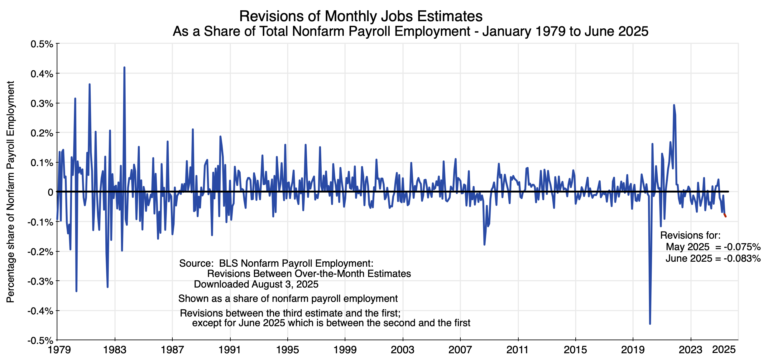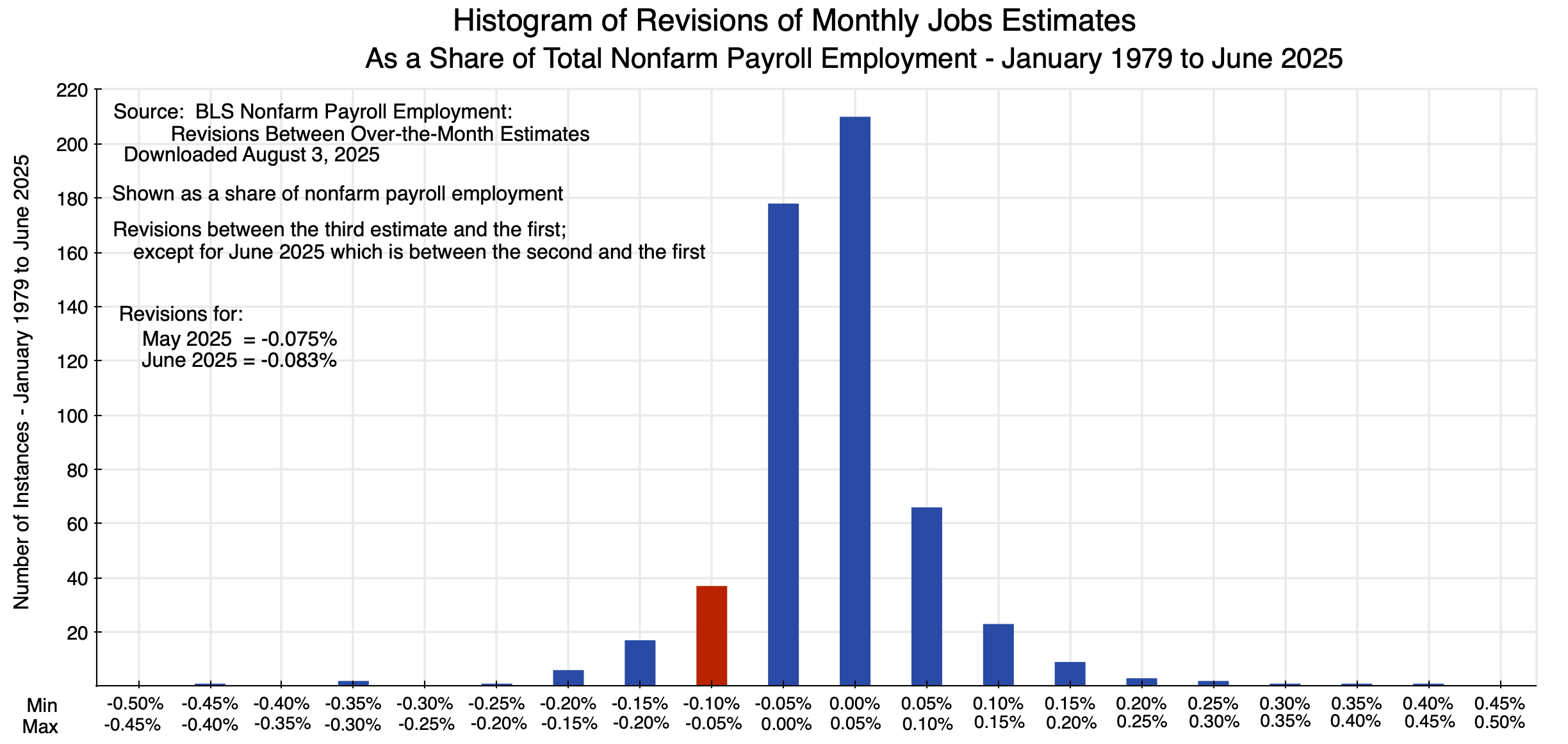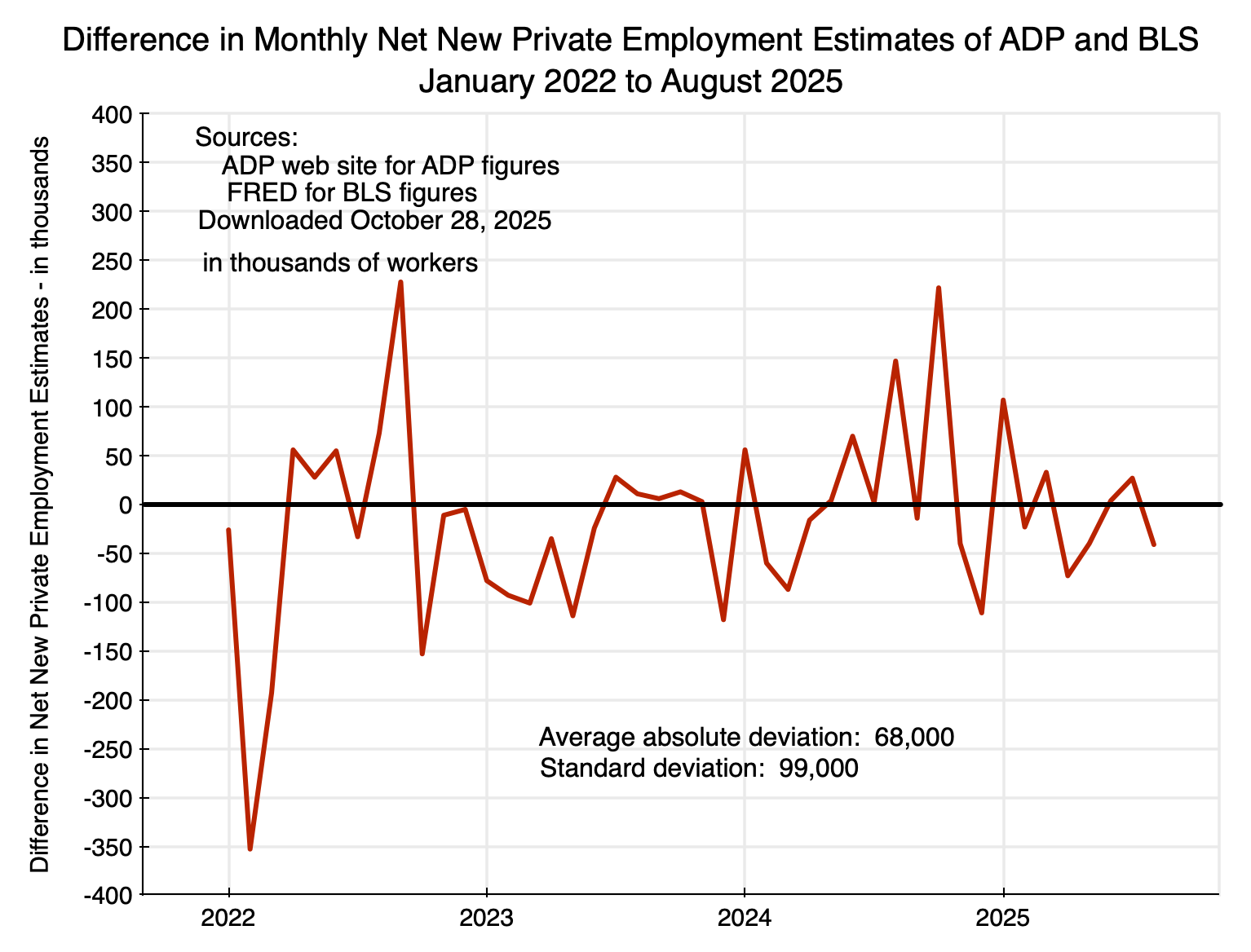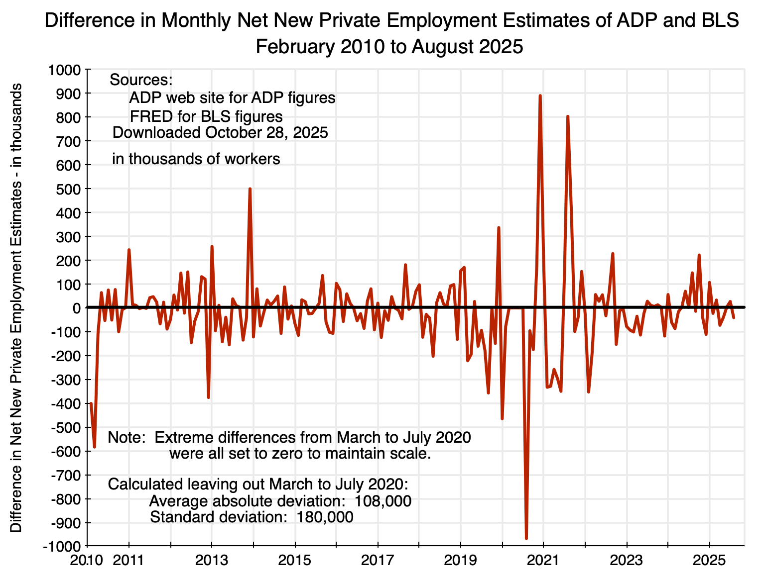 I have removed from the chart the figures that would apply for the period from March 2020 to July 2020. This was during the peak of the Covid disruptions, and the differences in the monthly net new jobs estimates were huge. The largest was for April, where ADP estimated private employment fell by 6.1 million while the BLS estimated it fell by 19.6 million – a difference of 13.5 million. But these were far from normal circumstances, and including these months on the chart would have distorted the scale. They were instead set to zero.