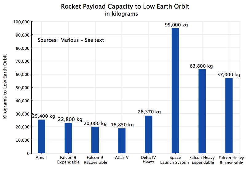 Specifically, the initial model of the SLS (scheduled to be tested this November 2021) is labeled the Block 1, and has a lifting capacity of 95,000 kg to low earth orbit.  The figures for the Block 1 are the ones that are being used in the charts in this post.  However, its capacity would only be sufficient for the first three flights (including the test flight), where the third flight would support the first landing of a crew on the moon under the Artemis program.  Following that, a higher capacity model, labeled the SLS Block 1B, would need to be developed, with a lifting capacity to low earth orbit of 105,000 kg.  To achieve that, a new second stage would be developed using four of the RS-10 rocket engines (versus a second stage with just a single RS-10 engine in the Block 1 version).