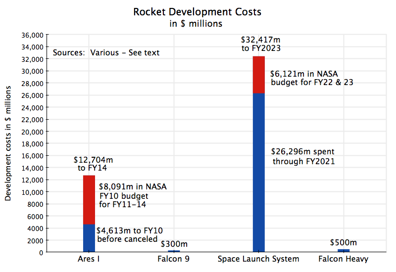 In part this is semantics, but treating the period until the end of FY2023 as the SLS still in the development phase, the total NASA is expected to have spent developing the SLS will be $32.4 billion.  While its payload capacity is 50% larger than that of the Falcon Heavy, it would have cost 65 times as much to bring it to the point of being operational.  While there are of course important differences, it is difficult to understand why the development of the SLS will have cost 65 times, and possibly more, than the cost of developing the Falcon Heavy.  It is especially difficult to understand as the rocket engines (the main cost for a booster) of the SLS are models used on the Space Shuttle, the strap-on solid rockets are also from the Space Shuttle, and the RL10 engine used on the second stage is derived from that used on earlier US rockets, dating all the way back to the 1950s.
