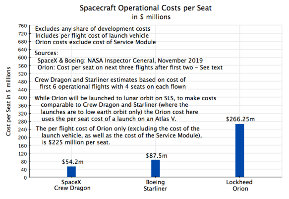 Similarly, it is expected that development of the Orion capsule (not counting the cost of the Service Module, that the Europeans are developing as their contribution to the program) will by FY2023 have cost almost 12 times the cost of developing the SpaceX Crew Dragon.  And the operational cost per seat will be 5 times higher for the Orion than the cost for the Crew Dragon flights, and 3 times higher than for the Boeing Starliner.