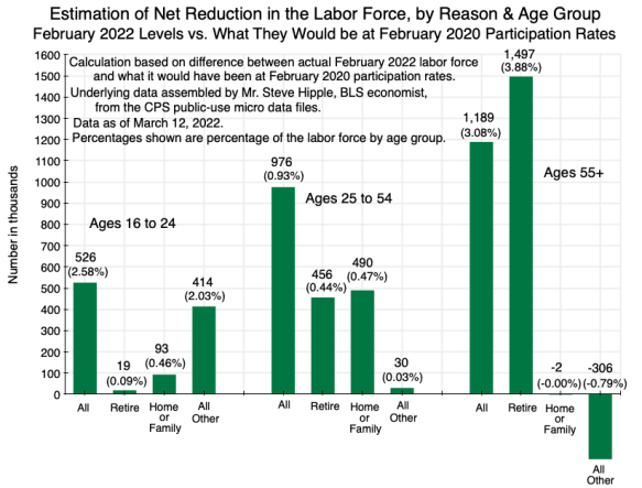 The second most important reason for leaving the labor force was to take care of home or family, with this accounting for 582,000 workers – 22% of the total reduction in the labor force in the scenario being examined.  This is also understandable in the context of the Covid crisis.  Many workers had to leave the labor force during the midst of the crisis to take care of school-age children when the schools were closed, but almost all schools are now once again open (albeit with some occasional disruption due to Covid outbreaks).  There might also have been a need to take care of family members who became sick during the crisis with Covid itself, and that might still have been a factor in February 2022 (as the Omicron wave subsided).  To the extent this has been Covid driven, these effects should also prove to be temporary as the Covid crisis recedes.