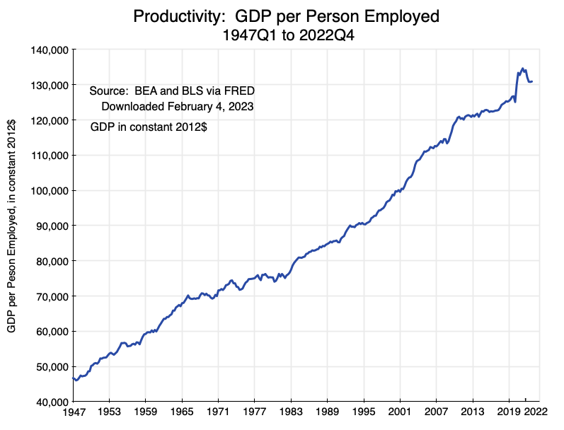 But productivity has declined over time even for the overall construction sector. In terms of simple labor productivity (what is produced in terms of the sector’s real value-added per employee, with those employed measured in full-time equivalent terms – i.e. with part-time workers included and weighted by their hours relative to full-time workers):