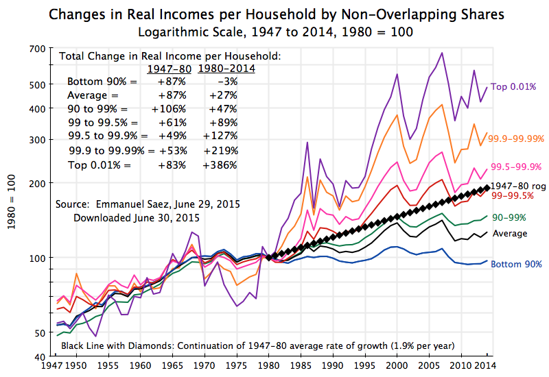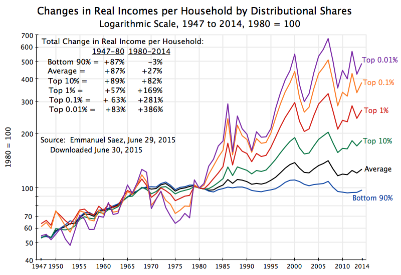 The distribution of the gains from growth have become terribly skewed since around 1980, as the chart above shows and as has been discussed in a number of posts on this blog (see, for example, here, here, here, here, and here). From 1980 to 2014, the bottom 90% of households have seen their real income fall by 3%, while the top 0.01% have enjoyed growth of 386%. This was not the case in the post-war years up to 1980: Over those decades the different income groups saw similar increases in their real per household incomes: By 87% for average income for the period between 1947 and 1980. But that ended around 1980.