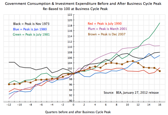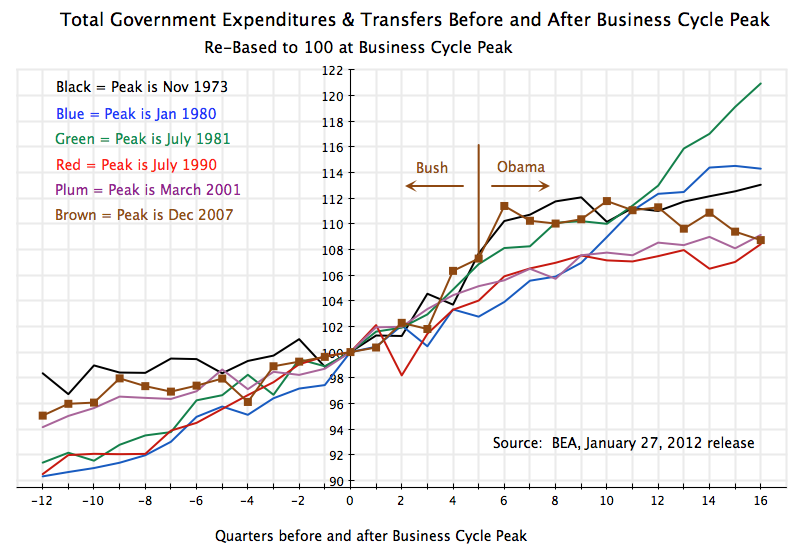 Maintaining government spending growth at the historical 2.24% rate would have led to government spending well below that seen during the Reagan years (in the recoveries from the July 1981 and January 1980 downturns), roughly where it was in the recoveries from the November 1973 and March 2001 downturns, and well above where it was in the recoveries from the July 1990 downturn (during the Clinton years) and of course the December 2007 downturn (under Obama). Government spending in the current downturn (the brown curve in the graph) has fallen substantially during the period Obama has been in office.