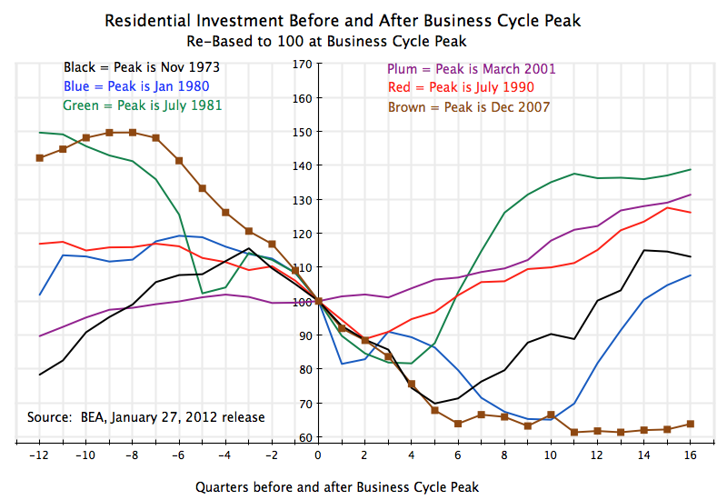 The second set of scenarios examine what the path of GDP would have been had government spending been allowed to grow, following the onset of the downturn in December 2007, at the same pace as it had during the Reagan years following the onset of the July 1981 downturn. The path followed is shown as the green line in the graph above on government spending around the business cycle peaks.