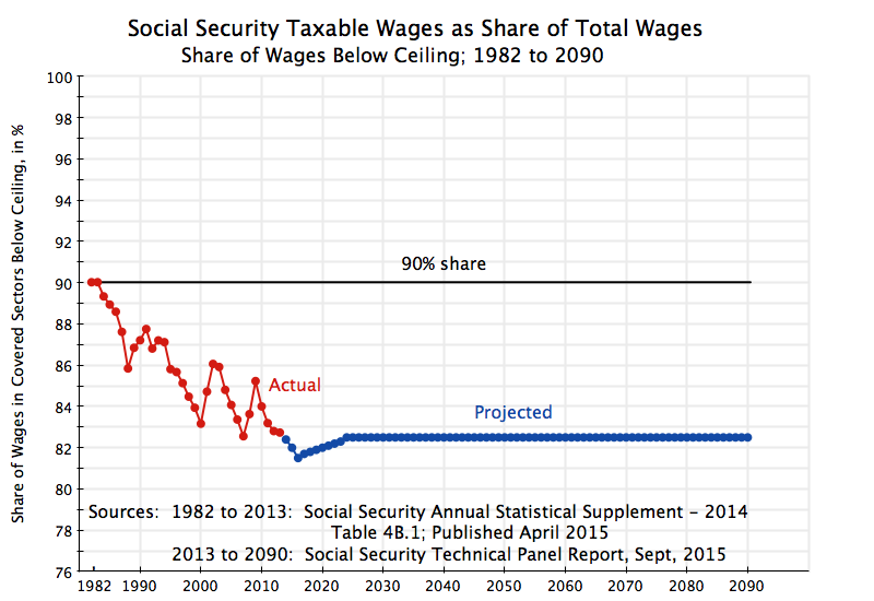 Going forward, the current forecasts for the path of the share of wages falling under the ceiling and hence subject to Social Security tax are shown as the blue curve in the chart. The forecasts (starting from 2013, the year with the most recent data when the Social Security Administration prepared these projections) are that the share would continue to decline until 2016. However, they assume the share subject to tax will then start a modest recovery, reaching a share of 82.5% 2024 at which it will then remain for the remainder of the projection period (to 2090). (The figures are from the Social Security Technical Panel Report, September 2015, see page 64 and following. The annual Social Security Trustees Report does not provide the figures explicitly, even though they are implicit in their projections.)