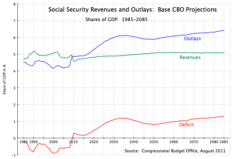 The obvious solution is to broaden the tax base for the Social Security tax to include incomes now excluded – which are also incomes that accrue to the rich. First, note that the shortfall to be made up when the Social Security Trust Fund is expected to be depleted (if nothing is done) in the 2030s would require a 20% increase in revenues. That is, following a transition between now and about 2030 as the baby boomer generation retires, the long term projection is that Social Security tax and other revenues will level off at about 5% of GDP, while Social Security obligations will level off at about 6% of GDP. That is, we will need revenues to increase by about 20% to make up the shortfall, to get to 6% of GDP from 5%. (A more precise estimate, but from my blog post of a few years ago, is an increase of 19.4%).